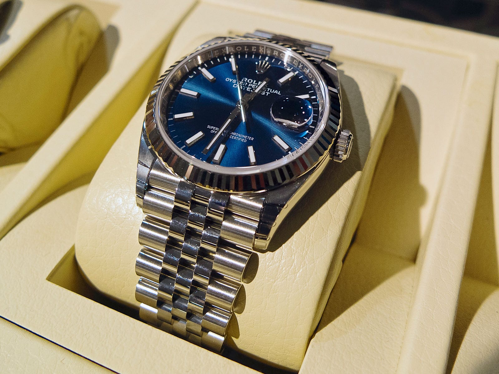 The watch’s 36 mm wide case is the right size. The satin-polished steel bracelet has a comfortable feel and is of high quality. The color of the blue board is stunning and versatile. I always have something blue on. And even if it isn’t, the blue board still matches black, brown, and gray. The indexes and hands on the board are white gold and are luminized.