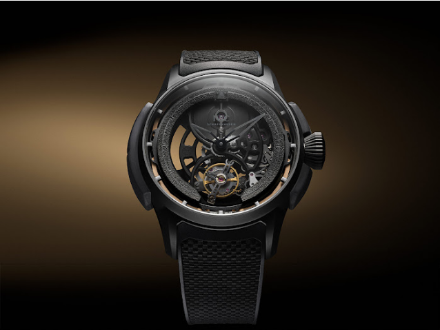 To reduce mass and optimise shock performance, the movement features a skeletonised construction with openworked plates, bridges, and rotor.